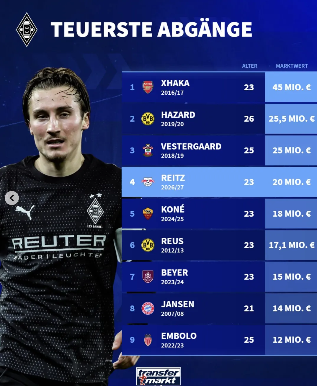 博鱼体育-门兴出售球员身价榜:扎卡4500万居首;赖茨2000万排第四